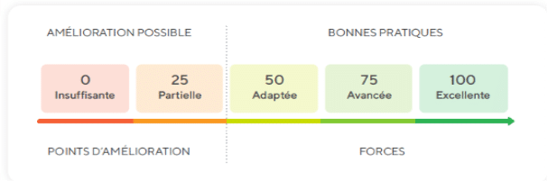 Ce système de notation en cascade permet de valoriser les efforts réalisés sur chaque aspect du management de la RSE. Même si une entreprise ne peut pas encore déployer des actions d’envergure sur tous les facteurs, elle peut obtenir une bonne note en se concentrant sur quelques leviers clés et en les documentant correctement.
