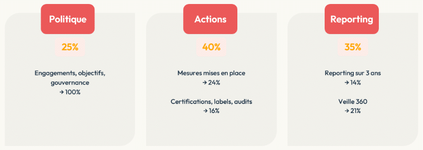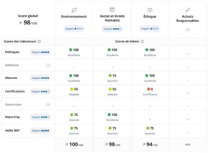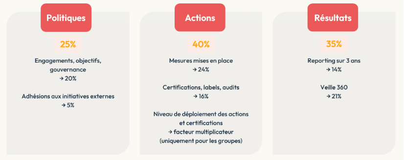 Les facteurs « Adhésions » et « Couverture des actions » ne sont pas pris en compte. De plus, aucun indicateur de performance (KPI) n’est exigé pour les piliers Éthique et Achats responsables, simplifiant considérablement le travail de reporting.